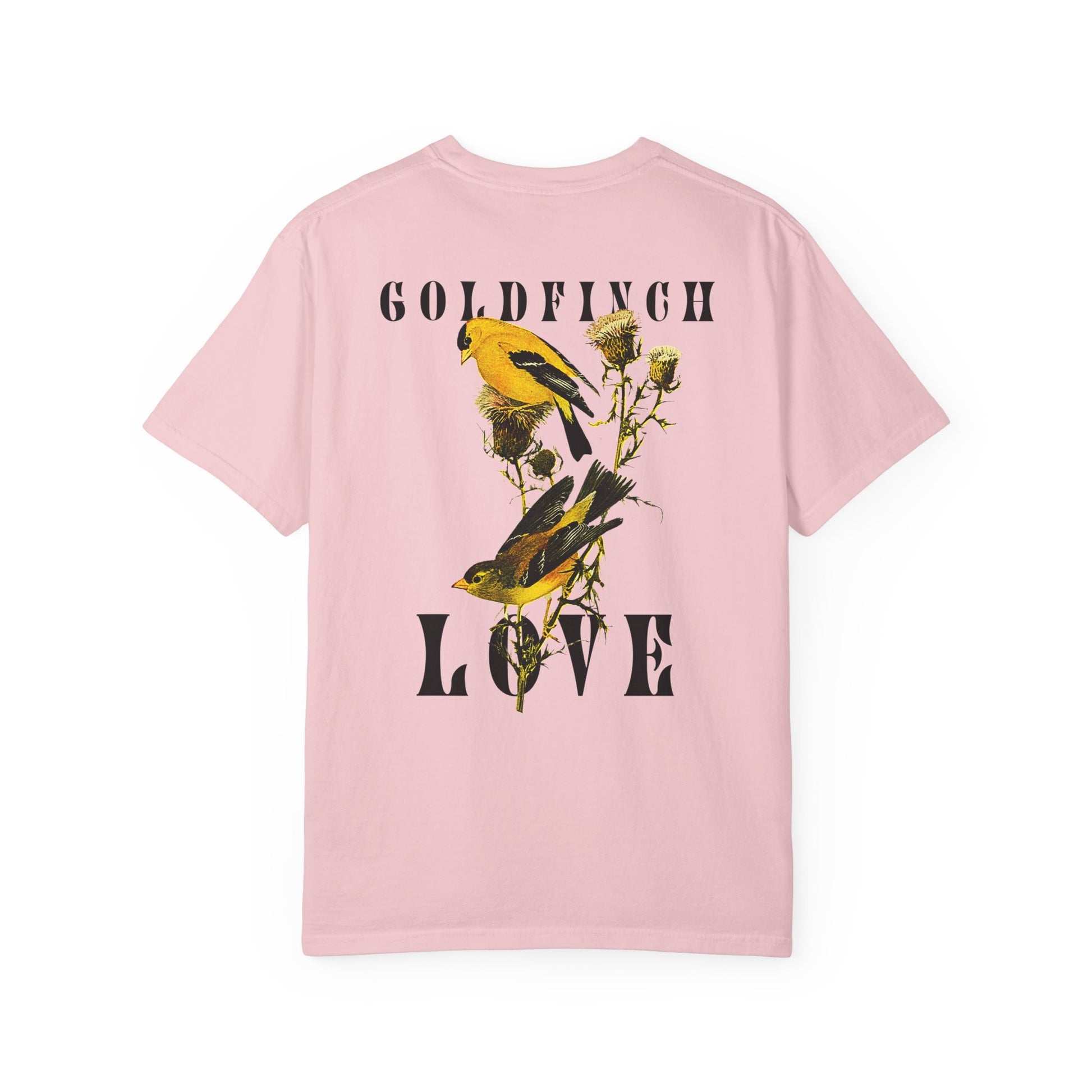 Few things are as extraordinary as a flock of Goldfinches rising out of a flower field like sunshine in flight. A tribute to these beautiful birds who bring joy to so many, our Goldfinch Love t-shirt is a lovely way to show up to your day with sunshine in tow no matter the weather. Goldfinches are gardeners too: they disperse seeds across the landscape helping create ecological resilience.
