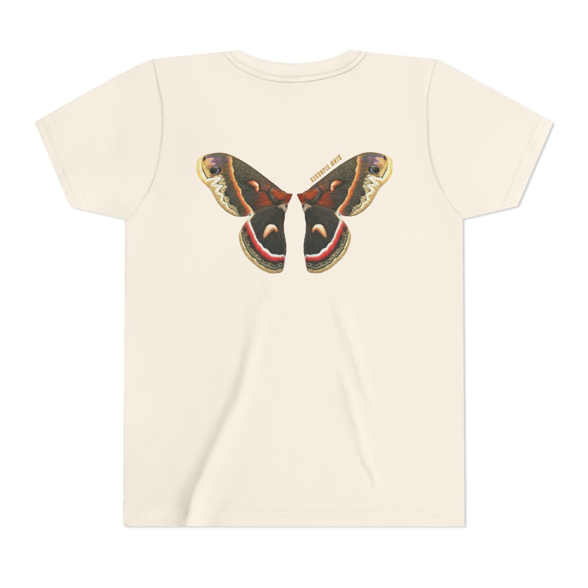 On the back of this tee, your child becomes a pollinator—featuring the beautiful wings of a Cecropia Moth. The front displays the name of one of its most important host plants: Maple.
